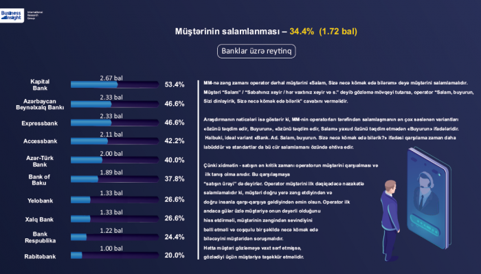 Azərbaycanın “Business Insight” araşdırma şirkəti tərəfindən Bankların Məlumat Mərkəzlərində (Call Center) müştəri xidməti və davranış standartlarının qiymətləndirilməsi üzrə “Kölgə Müştəri Araşdırması” həyata keçirilib.