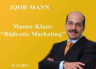 12.12.2011 tarixində “Brand Solutions” marketinq və konsultinq şirkətinin təşkilatçılığı ilə İqor Mann-ın master-klassı keçiriləcəkdir.