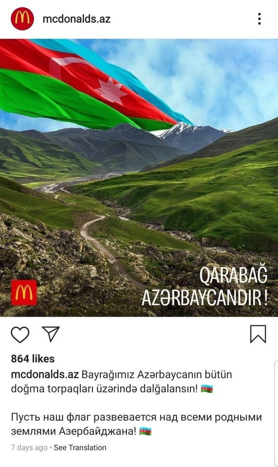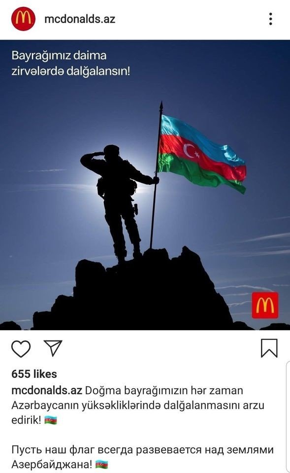 Amerikanın fast-food restoranları şəbəkəsi McDonald's-un Azərbaycan üzrə nümayəndəliyi I Qarabağ Müharibəsində azərbaycanlılara dəstəyini nümayiş etdirən vizual paylaşımlar edib.