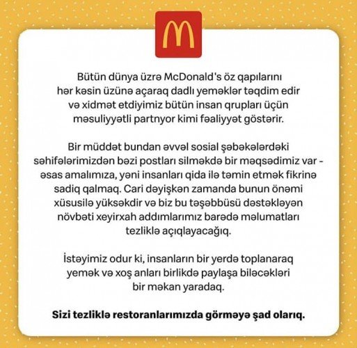 Maraqlısı budur ki, McDonald's Azərbaycan bu təzyiqlərdən sonra, açıqlama yayıb. Açıqlaması isə yenə də insanları və ən əsası onun müştərilərini qane etməyib. Eləcə də bu addımlarına haqq qazandırmış və insanlardan üzr istəməyiblər.