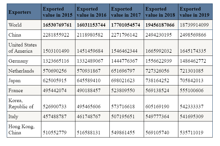 Dünya ixracat rəqəmlərinə baxsaq görərik ki, 2,5 trilyon dollarlıq ixracat həcmi ilə Çin yenə də birinci sıradadır (Bura Hong Kong və təkrar ixrac daxil deyil). 2015-ci ildən 2019-cu ilə qədər dünya ixracatına diqqət etsək görərik ki, cəmi dünya ixracat rəqəmi 20 trilyon dollar səviyyəsindədir.
