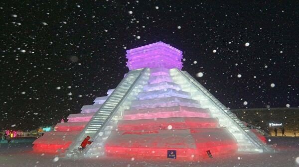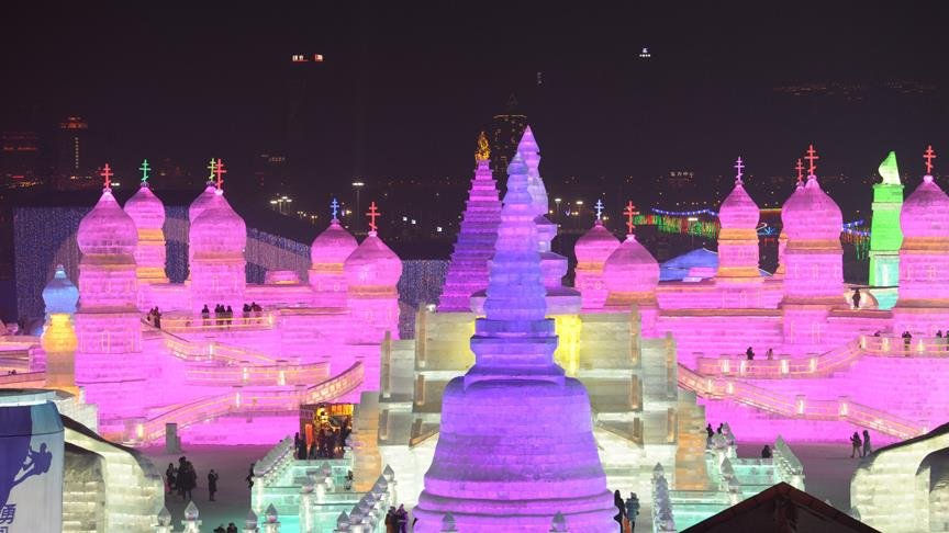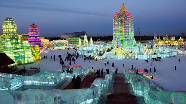 İşıqlandırılmış buzlu heykəllərin nümayiş olunduğu Xarbin beynəlxalq buz və qar heykəl festivalı rəngarəng görüntülər yaradıb.