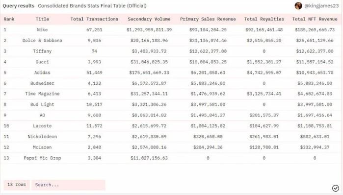 "Dune Analytics" məlumatlarına görə, "Nike" NFT kampaniyalarından ən çox gəlir əldə edən marka olub.