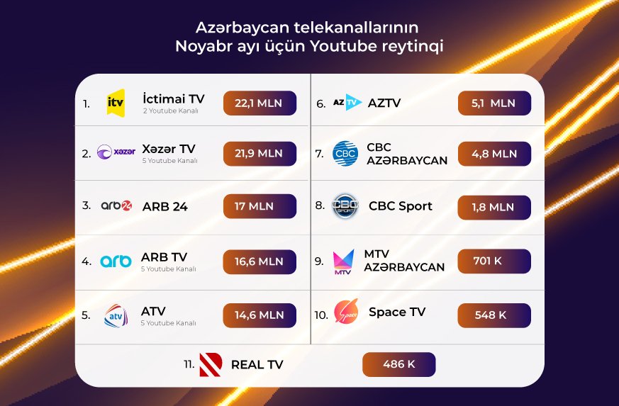 Bildiyiniz kimi 3 yerli telekanalın 5 Youtube kanalı var ki, videonun kateqoriyasına uyğun olaraq paylaşım edilir. Bu Youtube kanallarını bir-biri ilə müqayisə etdikdə maraqlı rəqəmlərlə qarşılaşırıq.