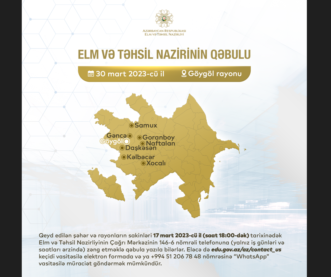 Adları çəkilən şəhər və rayonların sakinləri 17 mart 2023-cü il (saat 18:00-dək) tarixinədək Elm və Təhsil Nazirliyinin Çağrı Mərkəzinin 146-6 nömrəli telefonuna (yalnız iş günləri və saatları ərzində) zəng etməklə qəbula yazıla bilərlər. Eləcə də nazirliyin rəsmi saytının https://edu.gov.az/az/contact_us bölməsinə elektron formada və ya +994 51 206 78 48 nömrəsinə “Whatsapp” vasitəsilə müraciət göndərmək mümkündür.