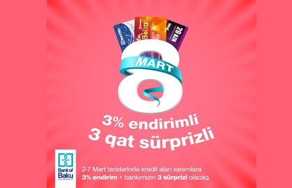 Bankdan “Marja”ya daxil olmuş məlumata görə, 2-7 mart tarixləri arasında Azərbaycan Respublikasının vətəndaşı olan hər bir xanım istehlak və pul kreditlərinin illik faiz dərəcəsində 3 %-lik endirim fürsətindən faydalana bilər. Bundan savayı, bu tarixdə kredit rəsmiləşdirən hər bir xanıma “Bank of Baku” tərəfindən 3 sürpriz nəzərdə tutulur. Sürpriz paketinə bunlar daxilidir: Bolkart, İdeal kredit kartı, həmçinin 20 manat dəyərində İdeal hədiyyə kuponu.