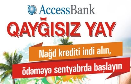 AccessBank 1 may tarixindən “Qayğısız yay” kampaniyasına start verib. Kampaniya çərçivəsində nağd kredit alan hər kəs, yay boyu Banka baş çəkmədən, ödəmələrə sentyabr ayından başlayacaq. Kampaniya 31 iyul 2013-cü ilədək davam edəcək.