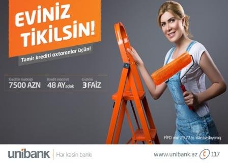 Unibankdan təmirli ev arzusunda olanlara şad xəbər. Artıq hər kəs evin təmiri üçün lazım olan məbləği Bankdan götürə biləcək. Unibank maksimal məbləği 7500 AZN olmaqla, 48 ay müddətinədək təmir kreditlərinin verilməsinə başladı, həm də 3% endirimlə. Zaminsiz və arayışsız olan təmir kreditlərini götürən müştərilərə, Unibankın xidmətlərindən müəyyən güzəşt hüququ verən Üzvlük kartı da veriləcək.