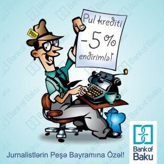 22 iyul Azərbaycan mətbuat işçilərinin peşə bayramı ilə əlaqədar “Bank of Baku” jurnalistlər üçün endirimli kredit kampaniyası elan edir.