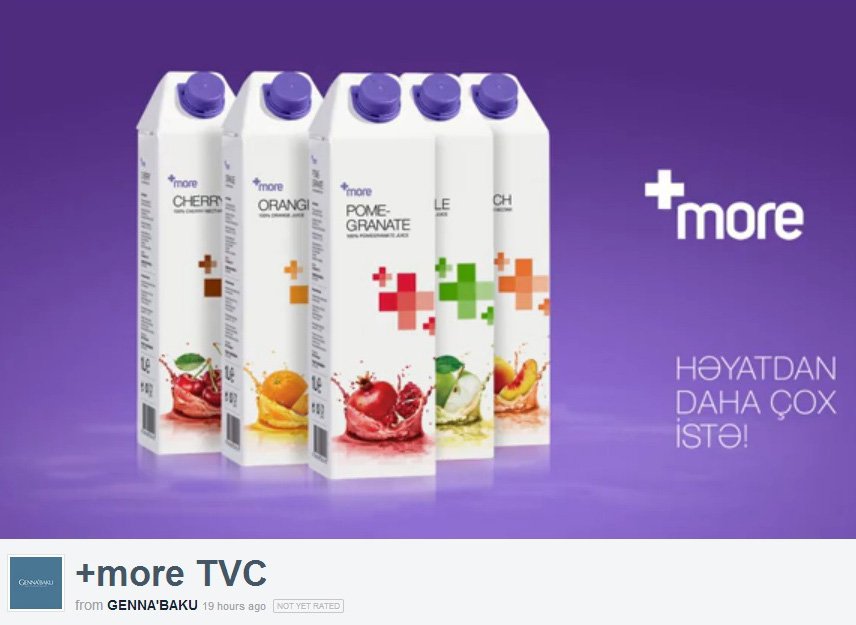 “Az-Granata” şirkətinin “+More” premium şirələri üçün marketinq kommunikasiyaları hazırlanıb. Yeni konsept məhsulun mövqələndirilməsini əks etdirməklə yanaşı, məhsulun 100% təbii olmasını ön plana çəkir.Müxtəlif meyvə çeşidlərindən istifadə olunaraq hazırlanan çarx və digər marketinq alətlərində meyvə şirələrinin həm insanın fiziki halına, həm də emosiyalarına müsbət təsiri yer alıb. Ümumi brend sloqanı kimi isə “həyatdan daha çox istə” şüarından istifadə edilib.