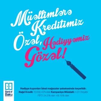 Qarşıdan gələn müəllimlər günü ilə əlaqədar Bank of Baku Azərbaycanın təhsil işçiləri üçün “Müəllimlərə kreditimiz özəl, hədiyyəmiz gözəl” kampaniyasına başlayır. Kampaniya çərçivəsində təhsil müəssisələrində çalışan, həmçinin digər müəssisələrdə təhsil sahəsi üzrə fəaliyyət göstərən müştərilər nağd pul krediti rəsmiləşdirdikdə “İdeal” mağazalar şəbəkəsində keçərli olan hədiyyə kuponu da əldə edəcəklər.