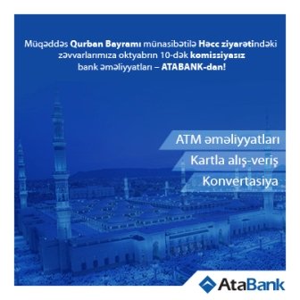 "AtaBank” ASC Azərbaycan xalqını qarşıdan gələn Qurban bayramı münasibəti ilə təbrik edir və bayram ərəfəsində yeni kampaniyasına start verir! Daim öz müştərilərini düşünən "AtaBank” ASC bu dəfə də Həcc ziyarəti zamanı müştərilərin ehtiyaclarını qarşılamaq məqsədilə onlara dəstək olur. Kampaniya çərçivəsində müştərilər Səudiyyə Ərəbistanında 2 həftə ərzində aparacaqları aşağıdakı əməliyyatlara görə Banka 0% komissiya ödəyəcəklər: