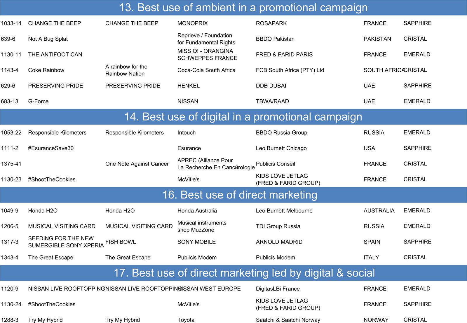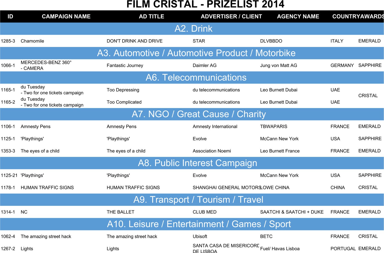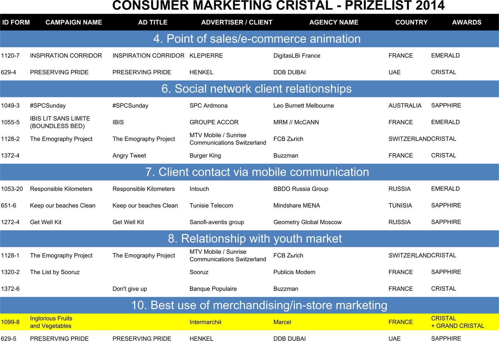 “Cristal Festival”ın sonuncu günündə son mükafatçılar da açıqlandı. Sonuncu gündə Marketing innovasiya, Radio, İstehlakçı Marketinqi, Film, Lyuksvə digər bölmələr üzrə Cristal (qızıl), Sapphire (gümüş) və Emerald (bürünc) mükafatçılar mükafatlarını aldılar.