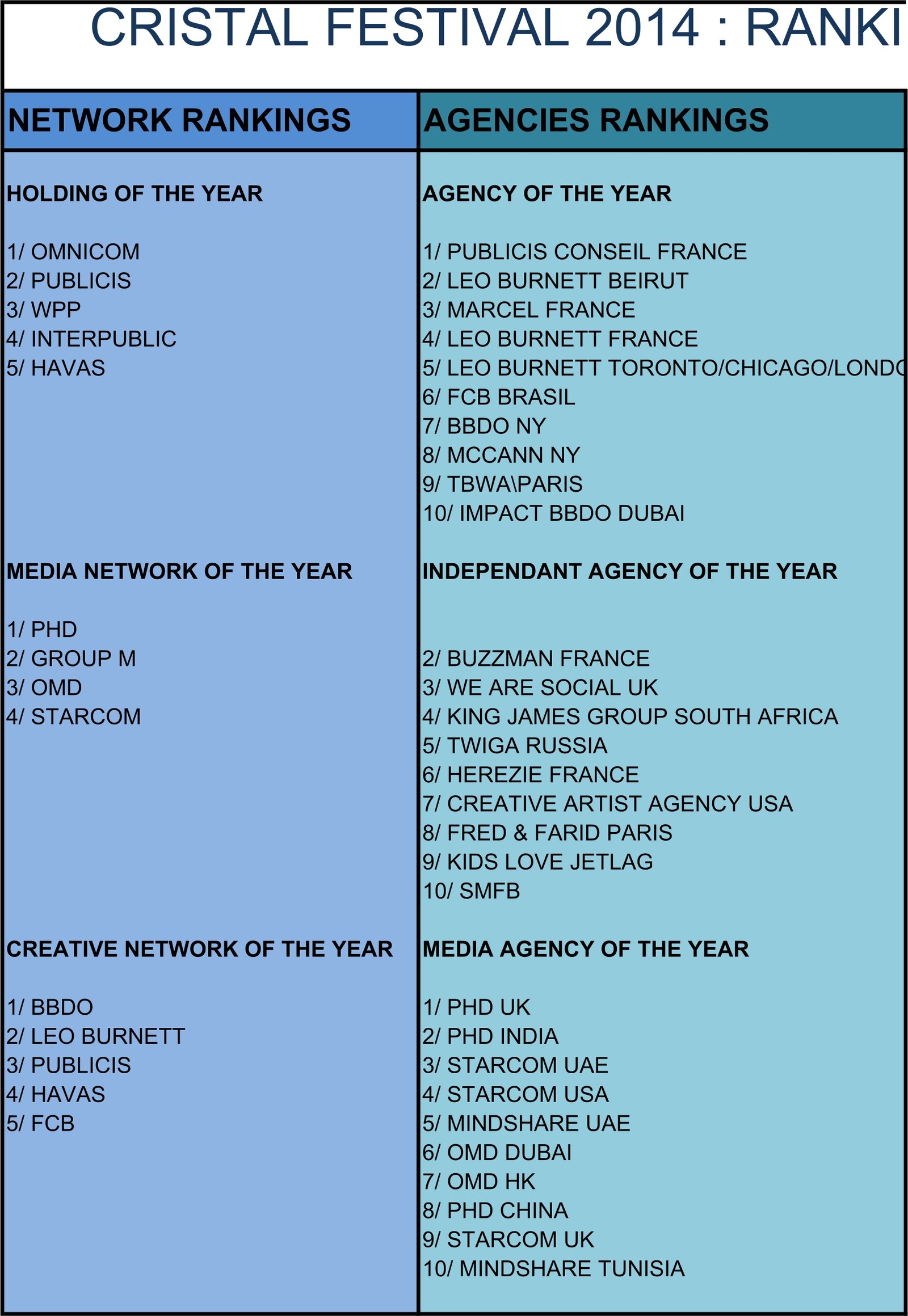 Hər zaman olduğu kimi Fetsivalın sonuncu günü üçün olan Grand Cristal qalibləri də öz mükafatlarını jüri prezidentləri tərəfindən aldılar. Tədbirin sonunda isə “İlin Holdinqi”, “İlin Media şəbəkəsi”, “İlin kreativ şəbəkəsi”, “İlin agentliyi”, “İlin müstəqil agentliyi” və “İlin mediya agentliyi” üçün olan reytinqlər açıqlandı.