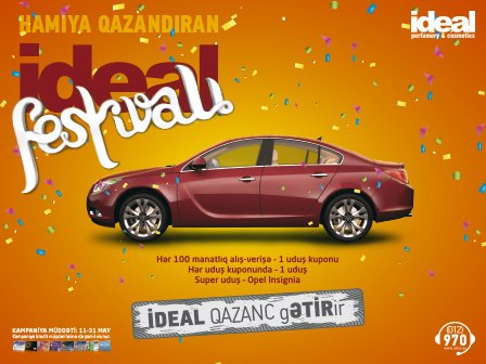 İdeal bu dəfə qazanc gətirdi! İdeal parfüm və kosmetika mağazaları şəbəkəsinin "İdeal Festivalı" adı altında başlatdığı uduş kampaniyasının "YelloAd" tərəfindən hazırlanmış konsepti məhz bu cür adlanır: İDEAL qazanc gƏTİRir! Vahid konsept əsasında kampaniyaya dair poster və uduş kuponu, film, radiospot, eləcə də vebbanerlər (rich-media və standart) hazırlanıb.