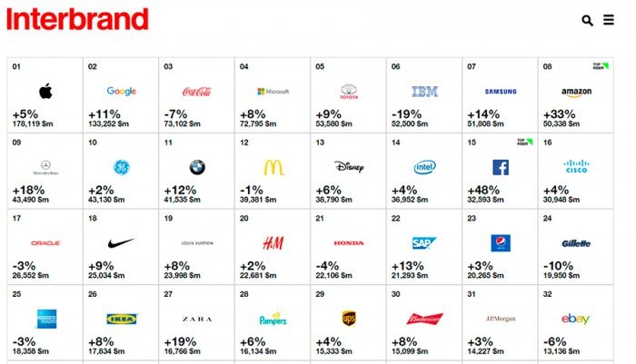 Interbrand agentliyi 2016 Best Global Brands-in növbəti tədqiqatları haqqında hesabat dərc edib. Mütəxəssislərə görə, bu gün top üç ən bahalı markalara – Apple (178,1 milyard dollar), Google (133,2 milyard dollar) və Coca-Cola (73,1 milyard dollar) daxildir.
