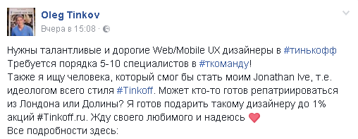Oleq Tinkov şirkəti üçün "Jonathan İve" kimi iş görəcək dizaynerə səhmlərin 1%-ni verməyə hazırdır. O, öz səhifəsində bu barədə elan və vakansiya yerləşdirib.