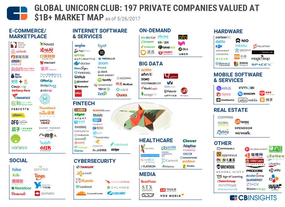 New York mərkəzli araşdırma qrupu CB Insights, dünya səviyyəsindəki 197 unicorn şirkətin (ən az 1 milyard dollar dəyərindəki xüsusi şirkətlər) bir xəritəsini çıxardı. 197 şirkətin iştirak etdiyi bu qlobal unicorn klubunun ümumi dəyəri, təxminən 679 milyard dollar idi. Bununla birlikdə bu 197 şirkətin hamısının aldığı ümumi investisiya miqdarı isə təxminən olaraq 142 milyard dollardı. Yalnız 2017-ci ildə bu kluba daxil olan ümumi şirkət sayı 22-di.
