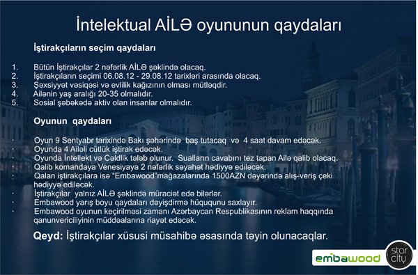 Embawood şirkəti Star City kolleksiyasını geniş kütlə arasında tanıtmaq üçün PR kompaniyası keçirməyi planlaşdırıb. Bu kompaniya Intellektual Ailə oyunu çərçivəsində baş tutacaq. Bu oyunda iştirak edəcək ailələr bir neçə turlardan keçərək super hədiyyə olan Venesiyaya istirahət turu qazanacaqdır. Embawood Qalib gələ bilməyən ailələri də yaddan çıxarmayıb. Qalib olmayan ailələrin hər birinə embawooddan 1500 azn məbləğində hədiyyə çeki veriləcək. Siz də bu intellektual oyunda iştirak edib kompaniyanın bir hissəsi olub hədiyyələrə sahib ola bilərsiniz. Yarışma 16 sentyabr tarixində keçiriləcək.