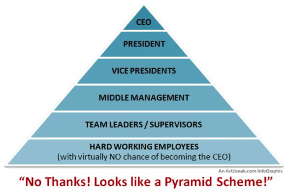 Həqiqət: Təşkilatın forması onun qanuniliyini müəyyən etmir. Əgər belə olsaydı, bir çox müəssisə və təşkilatlar qanunsuz olardı, çünki onlar eyni piramida şəklində qurulmuşdur. Piramida tipli qeyri-qanuni təşkilat real məhsul və ya xidmət təklif etmir və yeni üzvlərin sayına görə ödəniş edir. Qanuni şəbəkə marketinq proqramları satış həcminə və ödənişlərə əsaslanan faydalı, yüksək keyfiyyətli məhsul və ya xidmətlər təklif edir.
