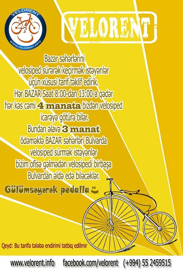 Velorent Azərbaycanda velosipedlərin icarəsi ilə məşğul olan ilk müəssisədir. Hal-hazırda Velorent yalniz Bakı şəhərində fəaliyyət göstərir və gələcəkdə öz fəaliyyətini regionlarda da davam etdirmeyi planlaşdırır.