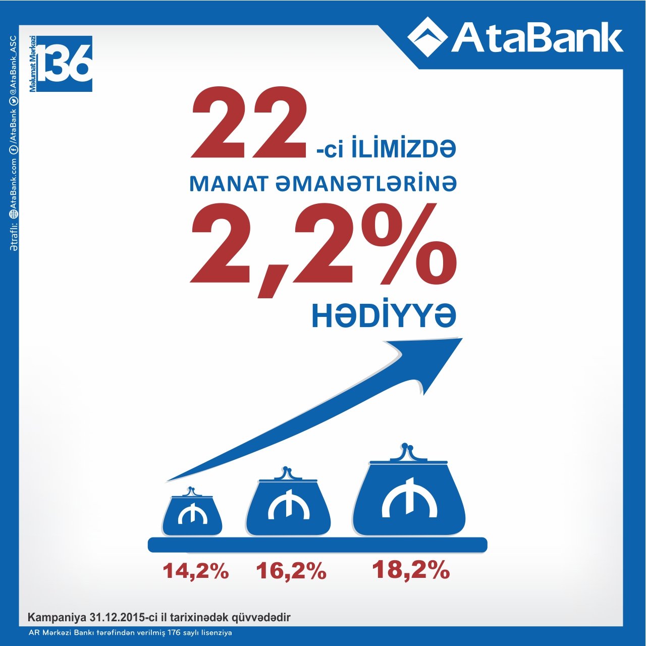 Qeyd edək ki, Fond tərəfindən sığortalanan əmanətlər üzrə maksimal illik faiz dərəcəsi 12% təşkil edir. Kampaniyanın şərtləri ilə ətraflı şəkildə siz www.atabank.com saytında, bankın Facebook sosial şəbəkəsindəki www.facebook.com/atabank rəsmi səhifəsində, eləcə də “AtaBank ASC”nin filiallarında tanış ola bilərsiniz. Kampaniya 31Dekabr 2015-ci il tarixinə qədər davam edəcək. 1993-cü ildən fəaliyyət göstərən "AtaBank" ASC Azərbaycanın ən böyük kommersiya strukturlarından biridir. Bu gün "AtaBank" yüksək texnologiyalı universal bank olmaqdadır. Bakıda və ölkənin müxtəlif regionlarında Bankın 26 filial və şöbəsi fəaliyyət göstərir. Bank korporativ və fərdi müştərilərə tam xidmətlər spektrini təqdim edir.
