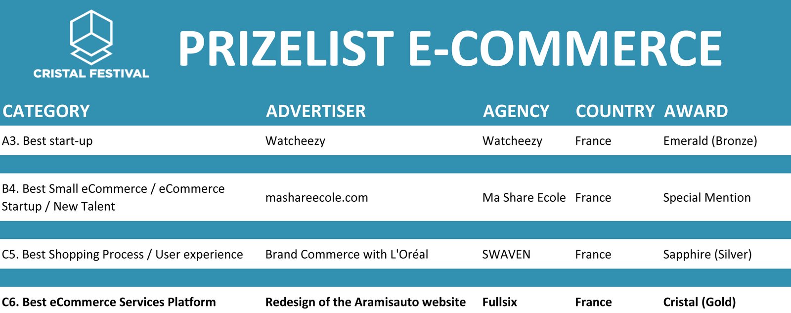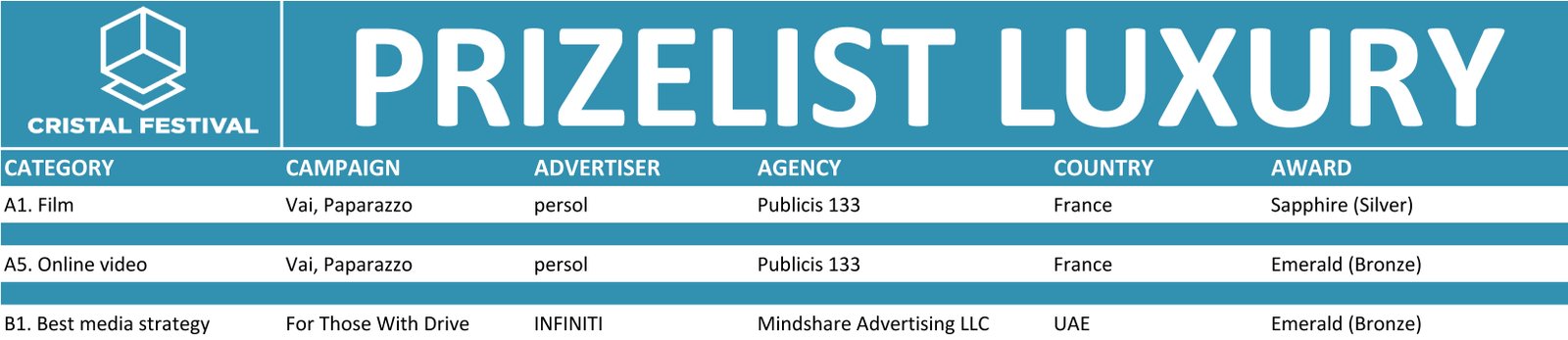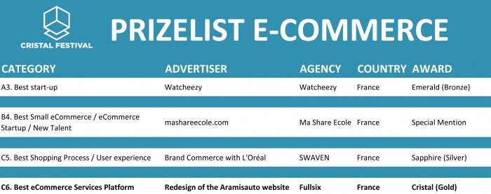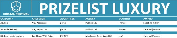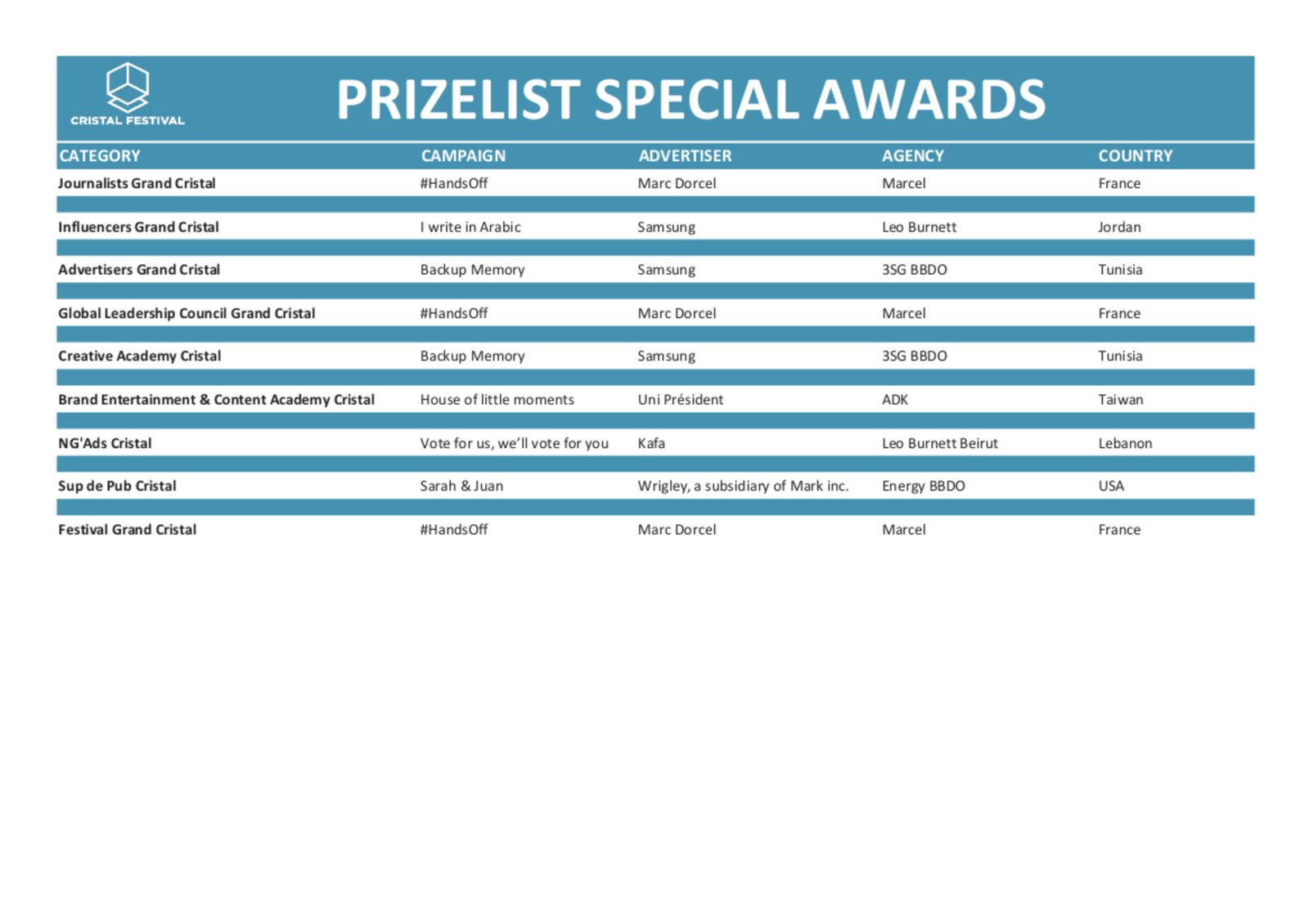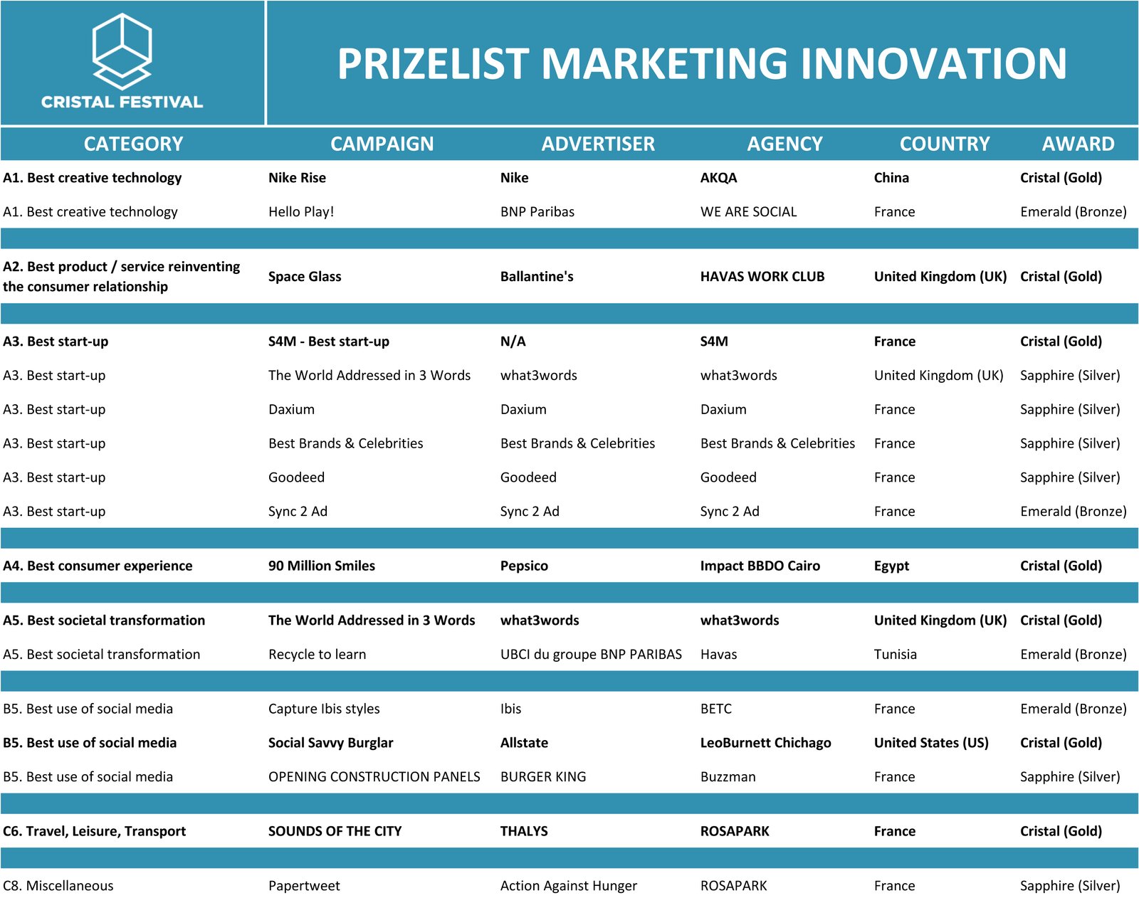 "Marketinq İnnovasiyası" kateqriyasında açıq aşkar seçilən bir iş olmadığından, "e-commerce" kateqoriyası isə bu il ilk dəfə keçirildiyindən və çox iş daxil olmadığından kateqoriyaların baş mükafatını qazanan olmadı. "Lyuks" kateqoriyasında isə nə Cristal nə də baş mükafat olan Grand Cristalı qazanan olmadı. Festivalın baş mükafatı "Festival Grand Cristalı" isə Marcel agentliyinin Marc Dorcel üçün yaratdığı #HandsOff işi qazandı.