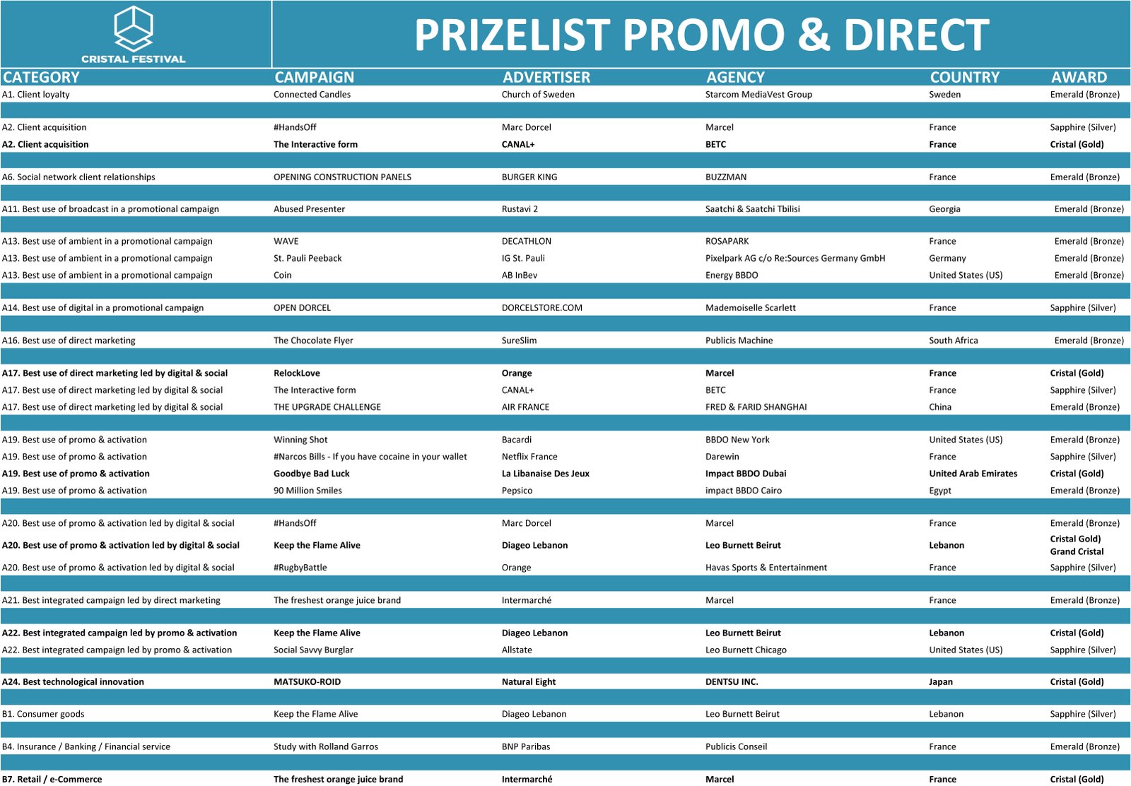 "Cristal Festival"ın dördüncü günündə "promo və birbaşa", "brend mədəniyyəti", "marketinq innovasiyası", "e-kommersiya", "lyuks" və "xüsusi mükafat" kateqoriyalarında qaliblər elan olundu. "Promo və birbaşa" kateqoriyasında baş mükafatı olan grand Cristalı Alive Diageonun sifarişi ilə Leo Burnett Beirut tərəfindən hazırlanmış "Keep the flame alive" işi qazandı.