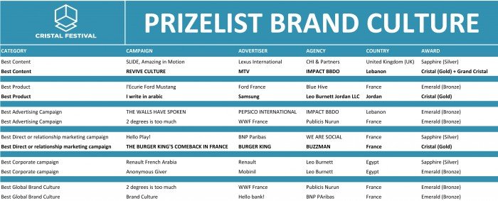 "Brend mədəniyyəti" kateqoriyasında Livanın İmpact BBDO agentliyinin MTV üçün yaratdığı "Revive Culture" işi baş mükafat olan Grand Cristalı qazandı.