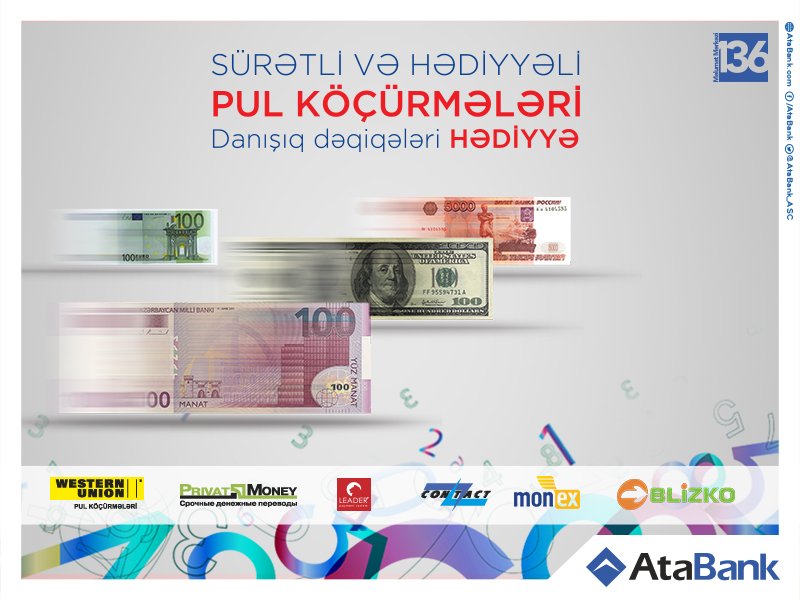 "AtaBank"da həyata keçirilən "Pul köçürənə/alana mobil danışıq dəqiqələri hədiyyə" aksiyası davam edir. Aksiyanın şərtlərinə əsasən "AtaBank"ın filiallarında pul köçürənə və ya alana 1 manatdan 5 manatədək mobil danışıq dəqiqələri hədiyyə olunur. Hazırda bank öz müştərilərinə 6 növ sürətli pul köçürmə sistemi üzrə xidmət göstərir. Bunlar Western Union, Privat Money, Blizko, Monex, Contact və Lider sürətli pul köçürmə sistemləridir.