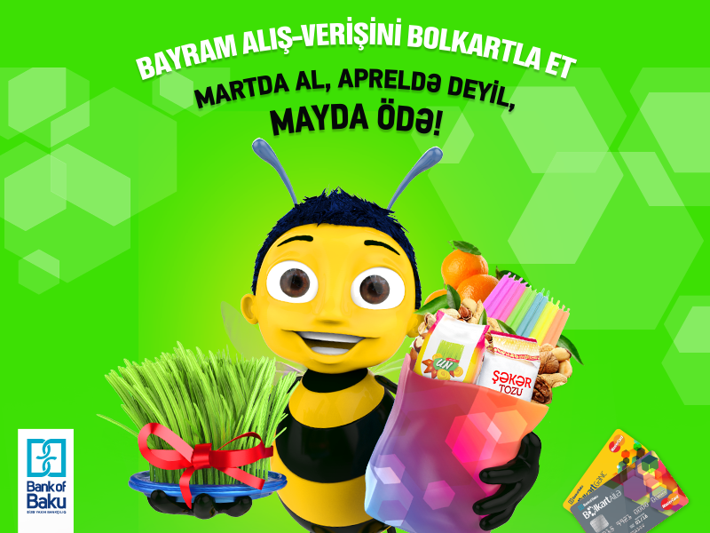 Bank of Baku, Novruz bayramı ərəfəsində müştərilərinə müjdə dolu yeni kampaniyalara start verir. Bankın Bolkart sahibi olan yüz minlərlə müştərisi bu Novruz bayram alış-verişindən xüsusi zövq alacaqlar. Belə ki, 19-22 mart 2016-cı il tarixlərini əhatə edən ilk kampaniya çərçivəsində, bayram alış-verişini Bolkartla edənlər, ödənişlərini 1 aya deyil, 2 ay sonra etmək imkanı əldə edəcəklər. "Martda al, Apreldə deyil, Mayda ödə" şüarı altında keçirilən bu kampaniya bütün Bolkart müştərilərinə şamil olunur. Kampaniya Bolkart partnyor şəbəkəsinə daxil olan bütün market və supermarketlərdə keçərlidir.