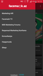 - Aşağıdakı şəkillərdən gördüyünüz kimi 7 bölməmiz var. Menyudan Siz Marketing AİR, Facemark.tv, Milli Marketinq Forumu, Rəqəmsal Marketinq Konfransı, Konsultasiya, Haqqımızda və Əlaqə bölmələrini görə bilərsiniz. Məsələn, facemark.tv bölməsinə girməklə bu sayta ayrıca daxil olmadan bütün videoları izləyə bilərsiniz. Marketing AİR bölməsində elə telefondanca qeydiyyatdan keçə bilərsiniz. Konsultasiya bölməsindən Sizi maraqlandıran sualları qeyd edə bilərsiniz.