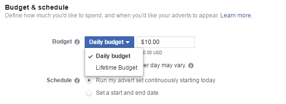 2) “Avtomatik” üsul isə odur ki, siz “Lifetime Budget” seçirsiniz. Onu seçəndə sizə büdcə təyin etməklə bərabər həm də reklamın yayımlanacağı tarixləri seçmək tələb olunur. Siz 19 avqust-24 avqust seçib, 10 dollarlıq büdcə təyin etsəniz o deməkdir ki, reklamınız 5 gün yayımlanacaq və 5 gün sonra, xərciniz 10 dollar olduqda reklam özü dayanacaq.