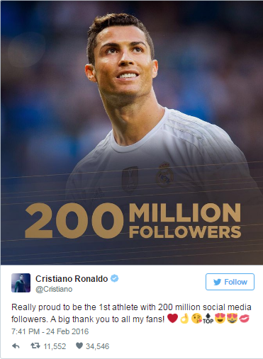 Fevralın 24-ü Real Madrid klubunun portuqaliyalı ulduzu Kristiano Ronaldo sosial şəbəkələrdə 200 milyon izləyiciyə çatdı. Bu, idmançılar arasında rekorddur. Məşhur Hookit portalı bununl bağlı infoqrafika hazırlayıb. Belə ki, Ronaldonun Facebook, Twitter və Instagram hesablarında olan izləyici (follower) sayı ümumiliklə 200 milyona çatıb.