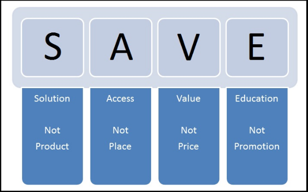 S.A.V.E. anlayışına əsasən təqdim olunan məhsulun xüsusiyyətləri, funksiyaları, və ya texniki üstünlükləri deyil istehlakçıların istək və ehtiyacları üçün təqdim edilən həllər; fərdi satış nöqtələrini və kanallarını müəyyən etmək əvəzinə istehlakçıların satınalma prosesini bütünlüklə əhatə edən inteqrasiya edilmiş çarpaz bir çıxış sistemi; qiymətin xərc, gəlir və ya rəqiblərin qiymətləri ilə qarşılıqlı əlaqəsini düşünmək əvəzinə təqdim olunan məhsul və ya xidmətin müştəriyə yaratdığı dəyər; məhsul və xidmətin bütün incəliklərini əks etdirən reklamlar, ictimaiyyətlə əlaqələr və fərdi satışların əvəzinə satınalma prosesi ilə əlaqədar istehlakçılara veriləcək təhsil daha əhəmiyyətlidir.